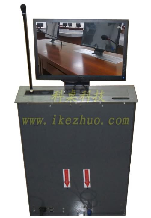 19寸科桌液晶屏升降器需要使用顯示屏?xí)r,隱藏在會議桌內(nèi)部的升降機(jī)把顯示屏從會議下面升到桌子表面;當(dāng)不使用顯示屏?xí)r,升降機(jī)自動下降,顯示屏隱藏在會議桌內(nèi)部,防盜、防塵;保持桌子表面的平整和美觀。