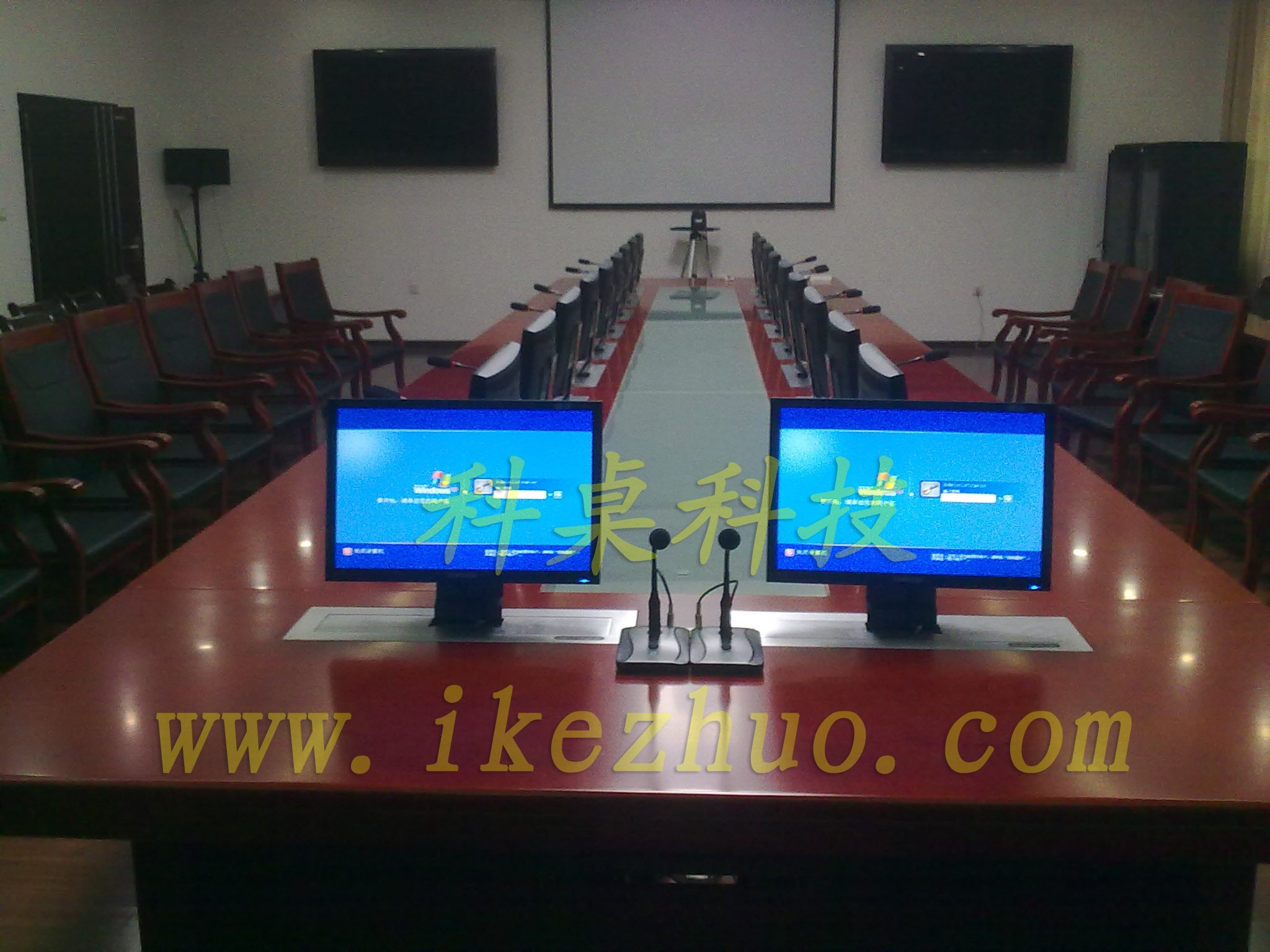需要使用顯示屏?xí)r,隱藏在會議桌內(nèi)部的升降機(jī)把顯示屏從會議下面升到桌子表面;當(dāng)不使用顯示屏?xí)r,升降機(jī)自動下降,顯示屏隱藏在會議桌內(nèi)部,防盜、防塵;保持桌子表面的平整和美觀。